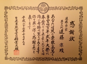 日光東照宮より宮司感謝状を受賞