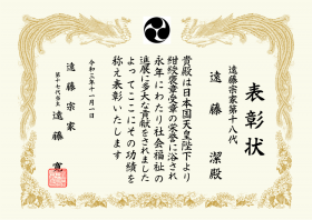 遠藤宗家当主が定められた基準に基づき、社会貢献の推進に関し長年尽力し、その功績が顕著で他の模範となる個人、法人代表者に対し、感謝状の贈呈を行います。これからも、持続可能な社会の実現のために、社会貢献活動をして参ります。